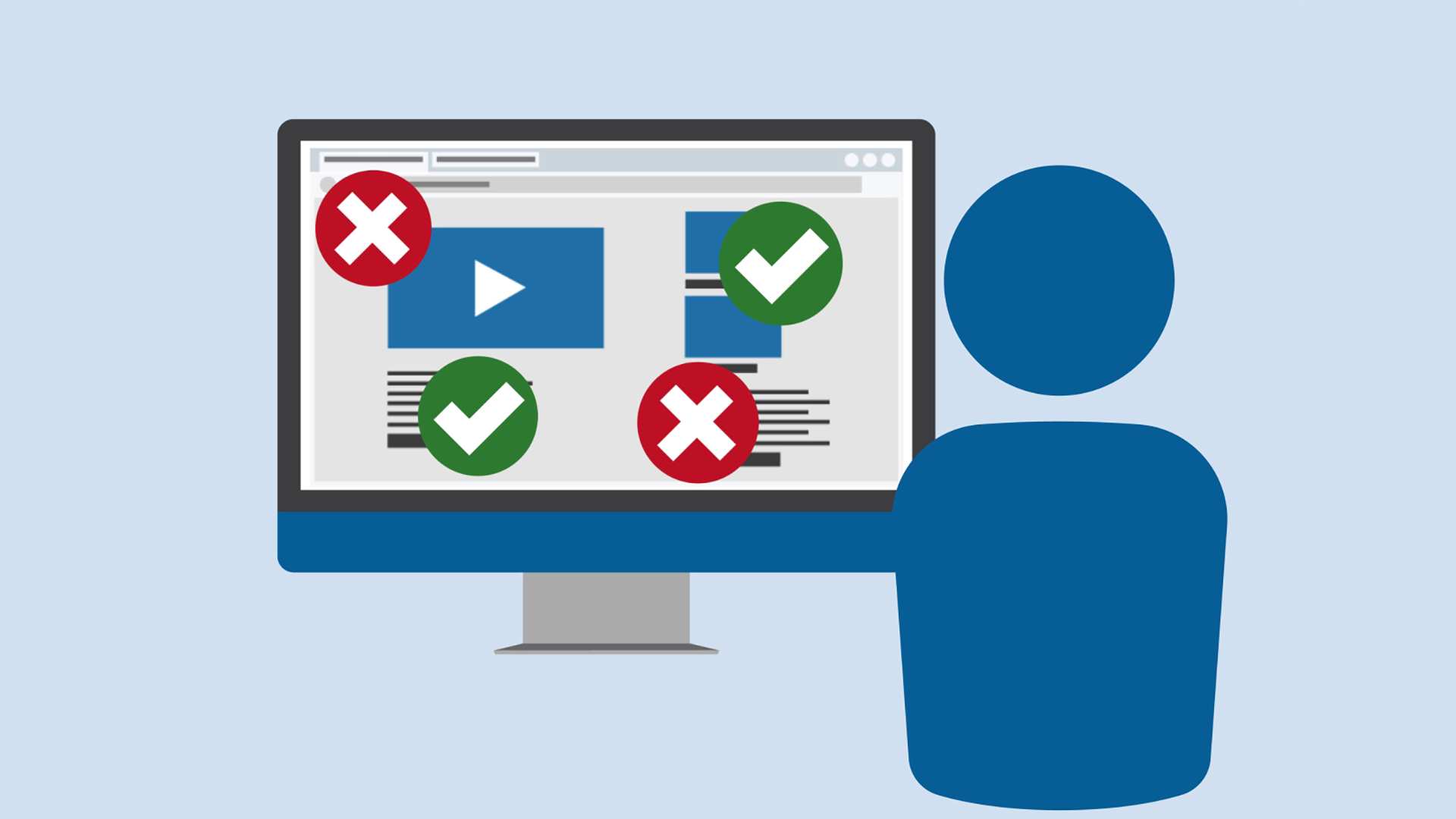 WCAG-EM also recommends involving real users with disabilities during evaluation, to help you address the real-life experience of your website users. A person in front of a computer displaying a website. Passes and fails are marked.